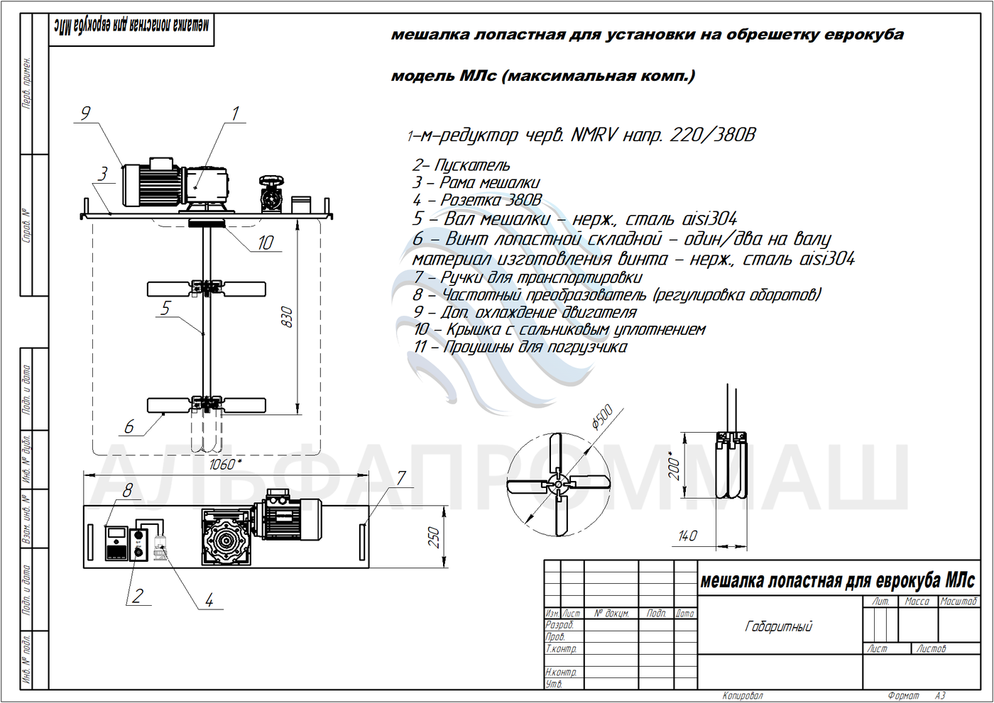 МЛс-1(2)х500/-L-830/-0,55 (до 3кВт) - 140 (до 560 об/мин) - 380В (220В)/-К-А(В)-Ус-Ч МЛс мешалка лопастная самораскрывающаяся 1(2) колличество винтов на валу 500 - диаметр винта в раскрытом состоянии (от 200 до 600мм)* L-830 - длина вала мешалки в емкости стандартная (по запросу можно изменить) 0,55 - мощность электродвигателя мотор-редуктора 140 - число оборотов вала мешалки 380В - напряжение К - исполнение по марке стали К-нержавеющая aisi304 (201, 316) А - общепромышленное исполнение электродвигателя (А) взрывозащищенный (В) Ус - крышка еврокуба с установленным сальниковым уплотнением вала Ч - частотный регулятор оборотов вала мешалки или отдельный шкаф управления |