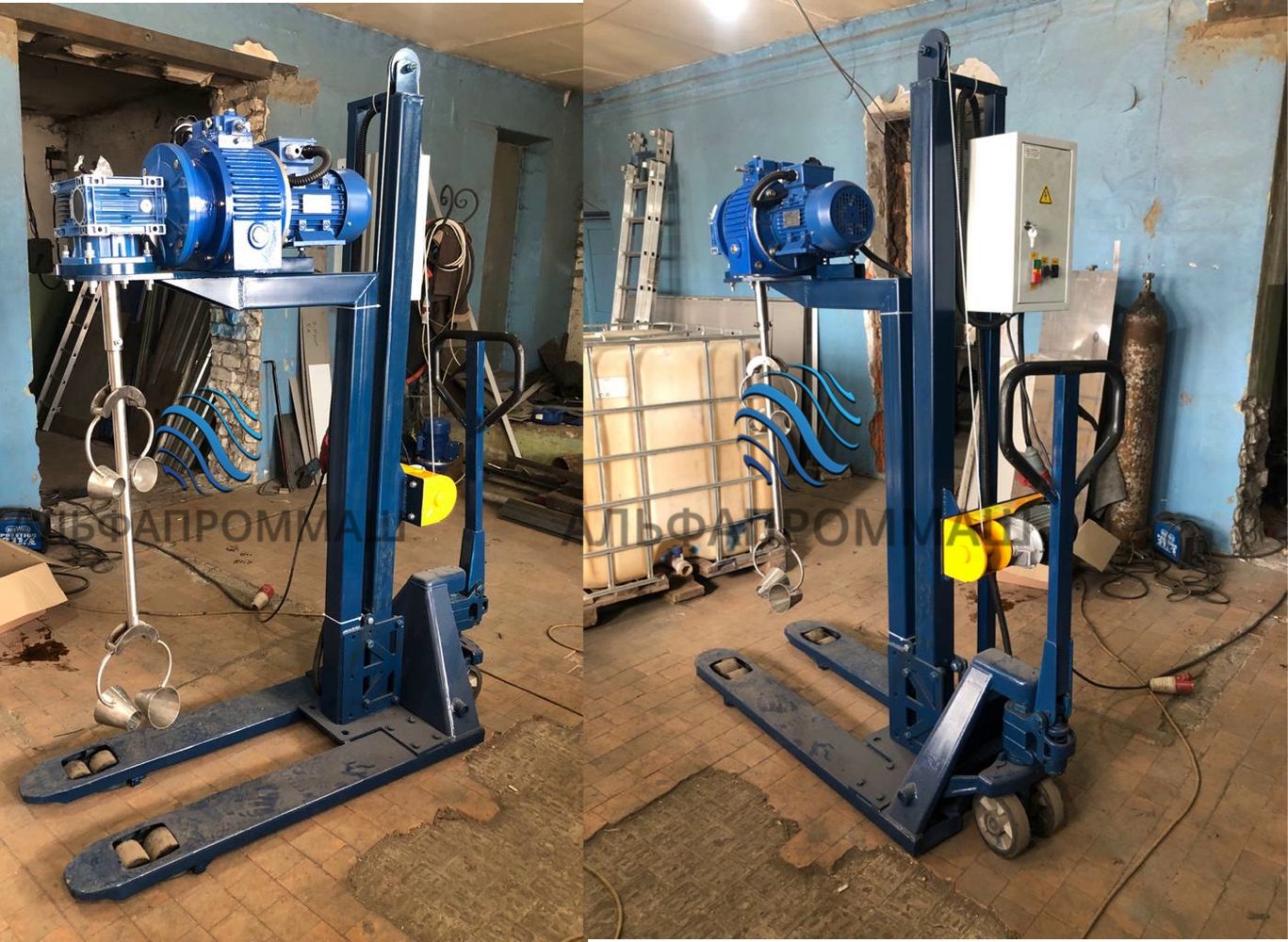 Описание: Данный тип передвижной мешалки сочетает в себе функции перемешивания и транспортировки еврокуба или емкости на поддоне. Идеально подходит для перемещения еврокубов и других емкостей, размещенных на паллетах. Основные характеристики: Высота: До 2.5 метров, компактные размеры для удобства транспортировки.Привод: Возможны варианты с мотор-редуктором, электродвигателем до 3000 об/мин или пневмомотором.Насадки: Съемные валы с различными насадками (конусные, лопастные, фрезерные, комбинированные) для разнообразных задач перемешивания.Подъем и Опускание: Реализуется с помощью электролебедки, обеспечивающей безопасное и точное позиционирование мешалки.Управление: Оснащена шкафом управления, отвечающим за работу мешалки и систему подъем/опускание. Преимущества: Многофункциональность: Позволяет одновременно перемешивать и транспортировать емкости.Удобство эксплуатации: Компактные размеры и простота управления делают устройство удобным для различных производственных процессов.Надежность: Изготовлено из высококачественной нержавеющей стали, обеспечивающей долговечность и устойчивость к агрессивным средам. 2.